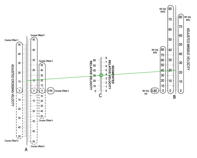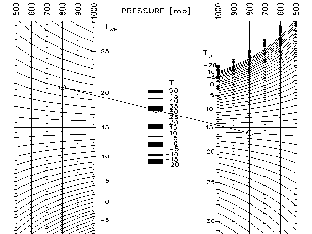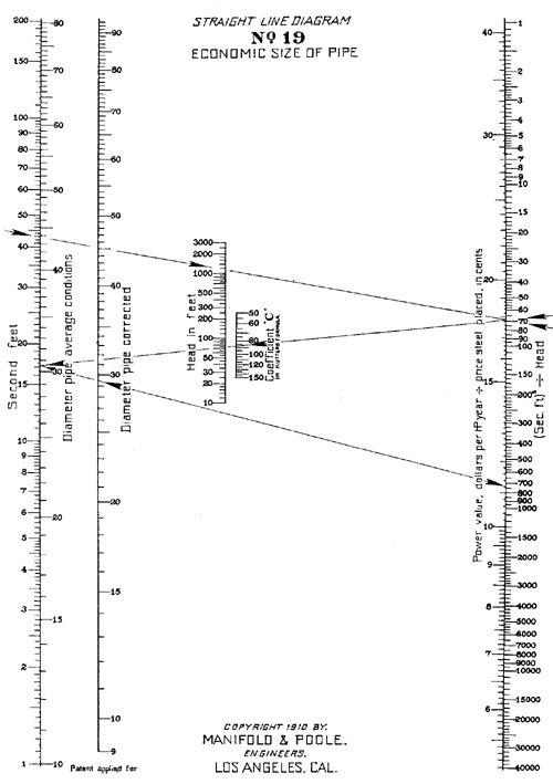 This is a standard parallel scale nomogram, but the two outer scales have been replaced by a family of scales. While this does make the nomogram more useful, it also introduces a new source of error. It is very important to use the corresponding outer scales (800 in the chart above). The nomogram will give an incorrect answer if for instance the 700 scale is used on the left and the 800 scale on the right.