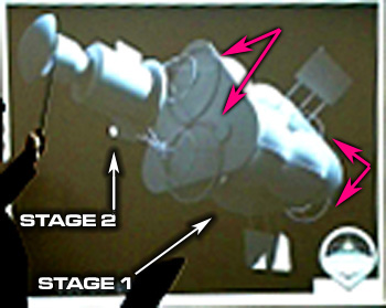 In normal use, the rear engine is turned on only to decelerate the ship, or to maneuver the crew compartment into the center of the forward engine's gamma ray shadow. Nudging the crew compartment, from behind, to one side or the other will be necessary during major course changes, because the crew compartment, much like a water skier, cannot turn simultaneously with the motor that pulls it and might otherwise drift out of the protective shadow. A spare engine also provides some insurance against the chilling possibility of irreparable damage to the leading engine or, worse, a break in the tether. In the former case, identical engine parts could be ferried up and down the tether and exchanged as necessary. In the latter, depending upon where the break occurs, with careful rearrangement of the ship's components along the tether, the remaining coil can be safely used to finish the outbound leg of the mission.