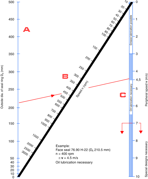 If the above nomogram had equal spacing on the scales, it would calculate B = C / A, or C = A * B. Note how the A and C scales have their zero points where they are cut by the diagonal B scale. Note that the zero point on the diagonal B scale overlaps the zero point on the C scale. This lets you know that the equation is B = C / A, not B = A / C.