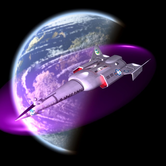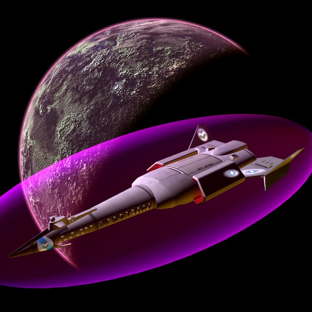 The planet is belatedly brought back into focus. Rachel mentions that when she does force fields, she uses incidence based gradients. This makes it colored on the edge, where the angle of incidence is large, and transparent in the center, where the incidence is small. In Blender, this is done with Ramp Shaders. I used it to make the violet force field bubble. Rachel pointed out that large insignia on the engines and the wing make the starship look like a child's toy. She was right. I reduced their size, and what a difference it makes. Just compare this image with the previous one. |