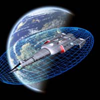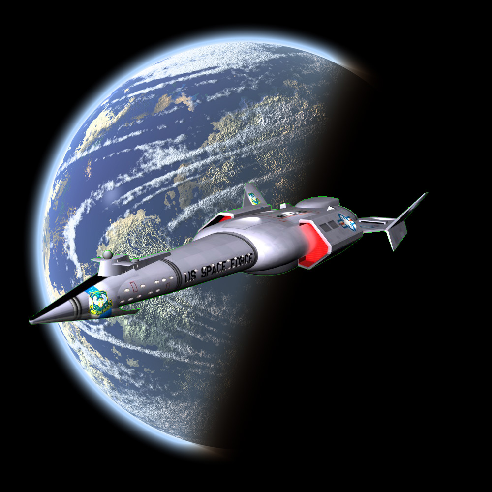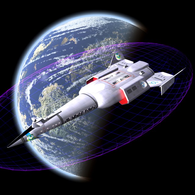 How about a Force Field? You know some client is going to want you to draw one, sooner or later. This is a quick elliptical solid, with the surface set to draw just the mesh lines. The egg shape took a bit of stretching to keep the tail tips from sticking out. Since the ship has tail surfaces extending upwards from the centerline, but nothing much extending downwards, I wound up making the ship off-axis in the elliptical solid. In a misguided attemtp to prevent the image from looking like a photo of a plastic model in front of a beach ball, I fuzz out the planet image, to simulate it being out of focus. Rachel points out with long lenses, spacecraft next to planets do look like photos of a plastic models in front of a beach balls. |