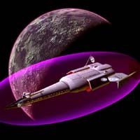 Using a plug-in for Adobe Photoshop called LunarCell, I make a backdrop image of a random planet in 0.3 seconds. In Blender, I make the background solid green, import the image into Photoshop, delete the green and add the LunarCell planet. This explains the slight green outline. Later I feel really silly when I discover that Blender can automatically load into the background any image you want. Oh well, at least the red illumination from the engines is looking nice. A computer artist named Rachel Kronick looked at the image and gently pointed out that the lighting on the planet and the starship were apparently coming from two different suns. Whups. |