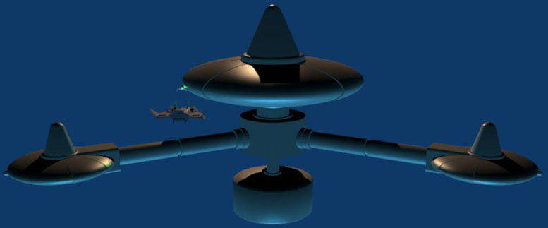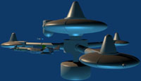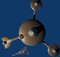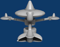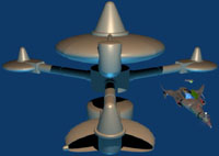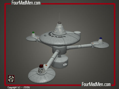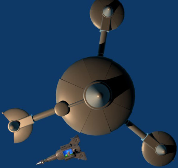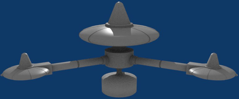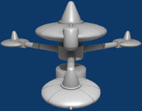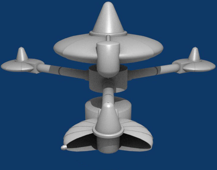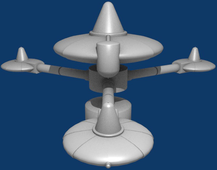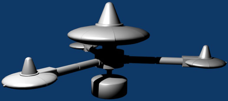 Lucky for me, master Blender artist FourMadMen had already made a definitive K-7 station. He used screen captures from the ST:DS9 show, and every reference image he could lay his hands on, including the Douglas Aircraft images. He had not released his mesh, but he had released orthographic renders. I used these as blueprints to trace around, to make crude copies of his marvelous renders.