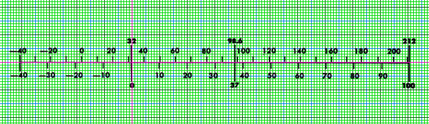 Now for the hard part. The first Fahrenheit tick mark is at 40. The function is 5/9 * ( F - 32 ) = x so the value is 4. Four times μ equals four millimeters. Measure to the four millimeter mark from the origin and draw the tick mark, labeling it with "40". You can see this in the upper section of the diagram.