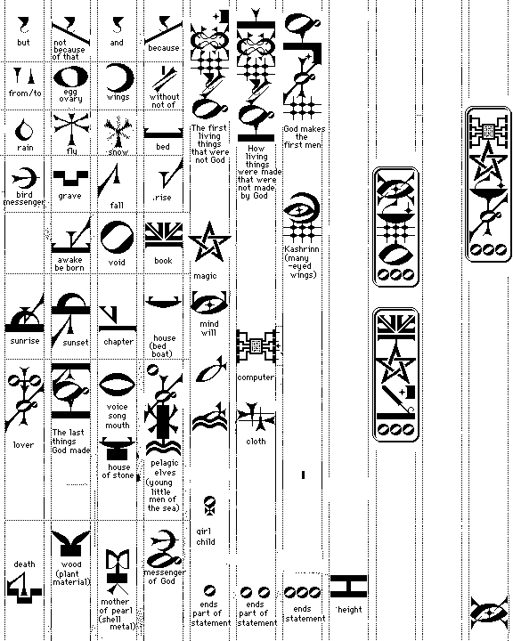 It should also be noted that some symbols are from the context of the original novel, and do not strictly correspond to our planet. For instance, in the book, water came before dry land. Mankind had to make houseboats to live on. This is why the glyph for "house" is a combination of the glyphs for "bed" and "boat". "Glass" and "Beltempest" were deities, with their mates "Selfinn" (Bride of Beltempest) and "Verdrinn" (Bride of Glass)