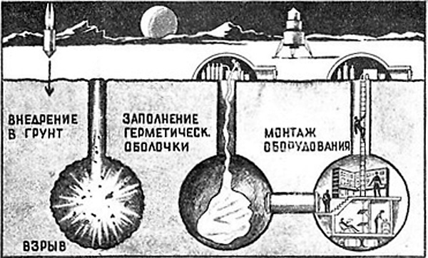 Not shown is step one: creating the spherical hole with a nuclear explosive. Artwork by Ben Kozak. From Britannica Yearbook of Science and the Future, 1972