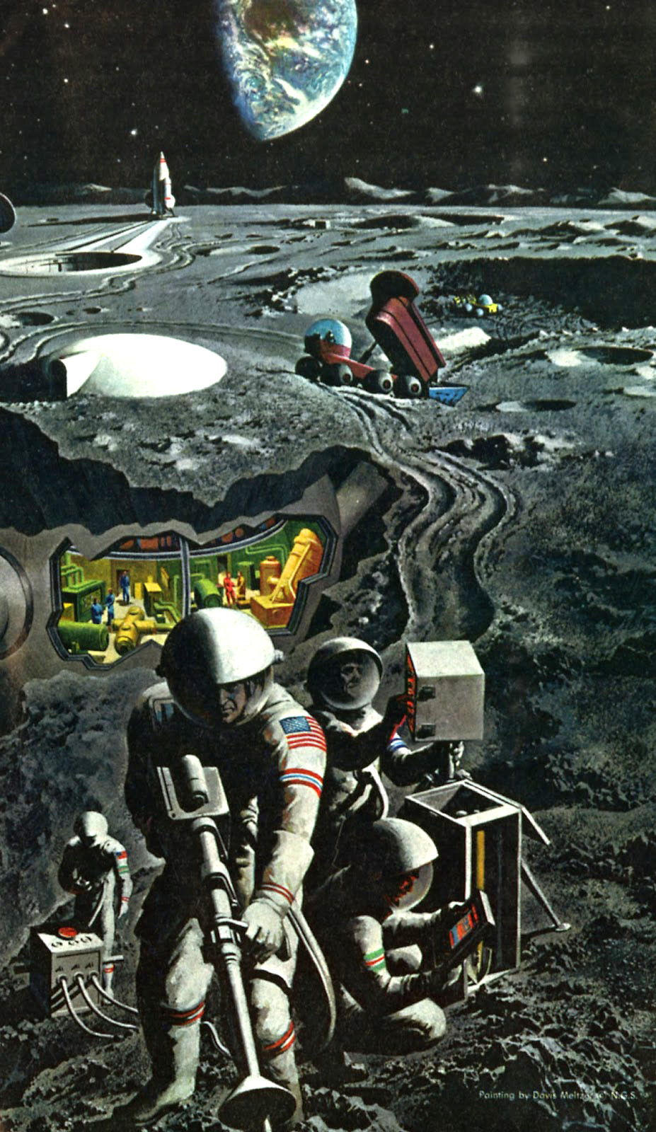 From National Geographic School Bulletin (1969). Artwork by Davis Melzer. Courtesy of Dreams of Space. Click for larger image.