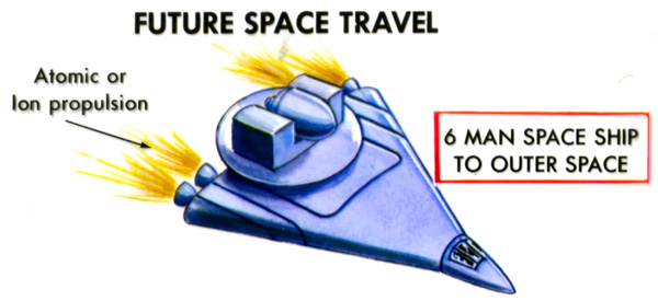 This is the Atomic Pulse Rocket, a pot-bellied space ship nearly the size of the