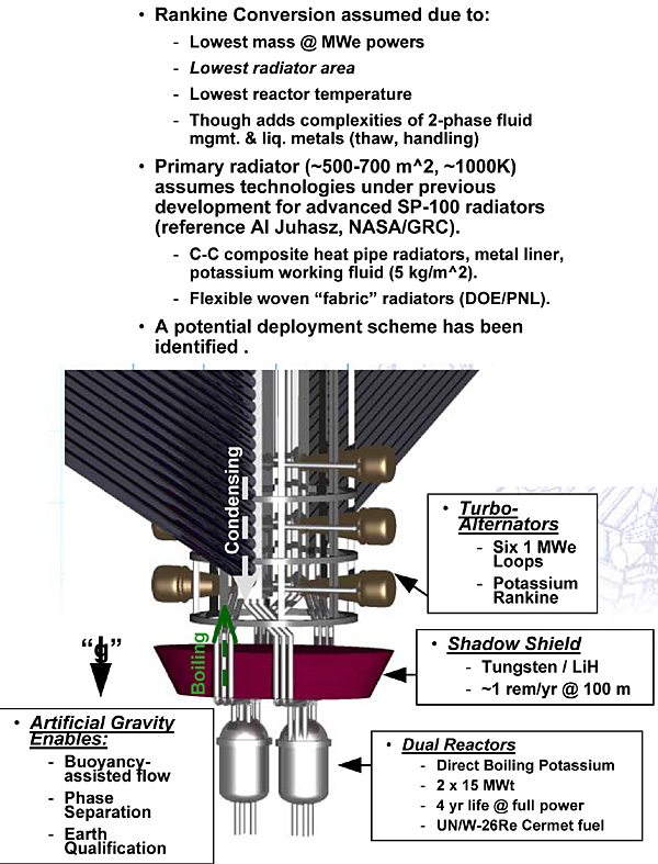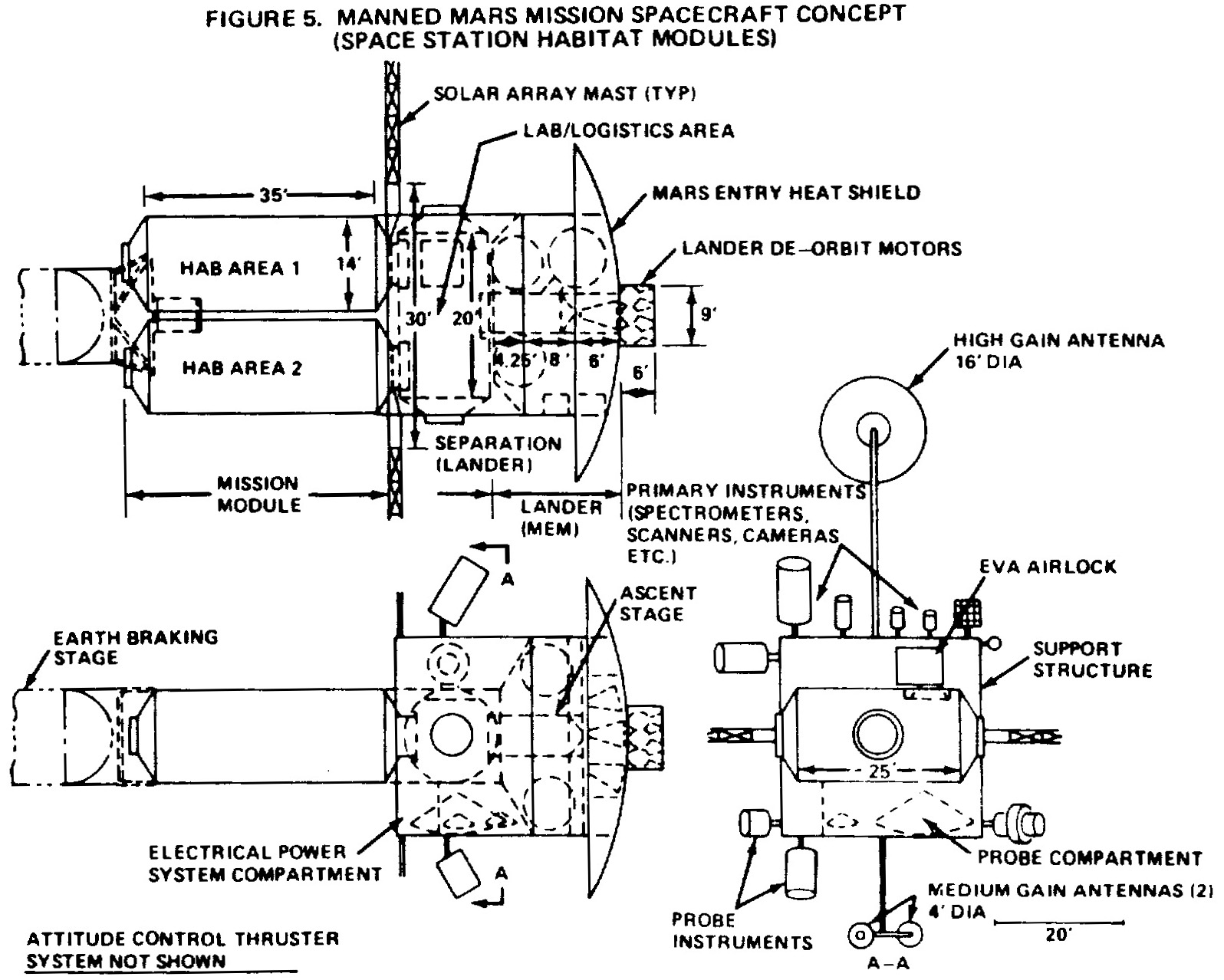 The payload is carried in two separate aeroshells. Shell 1 holds the habitat module, the CEV, the transfer node, and the TEI chemical stage. Shell 2 is integrated with the Mars lander. When the vehicle approaches Mars, both aeroshells abandon the nuclear stage (letting it sail off into the wild black yonder) and both shells separately aerocapture into MOI. They then temporarily dock in Mars orbit using the transfer node, before the lander departs for the Martian surface. The lander uses its integral aeroshell a second time to get to the surface.