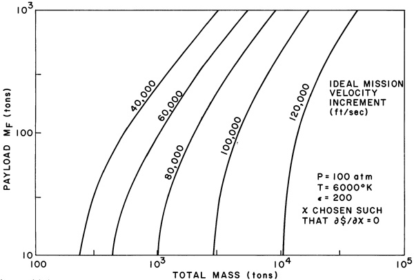 Cole Aldebaran The wet mass would be 45,000,000 kg. Specific impulse of 3,000 seconds. Propellant fraction of 0.7. Payload mass of 27,000,000 kg. Or it could soft-land a smaller payload mass of 20,000,000 kg on Luna. Air vents indicate it uses atmospheric gas for at least part of its reaction mass. Artwork by Roy Kerswill.