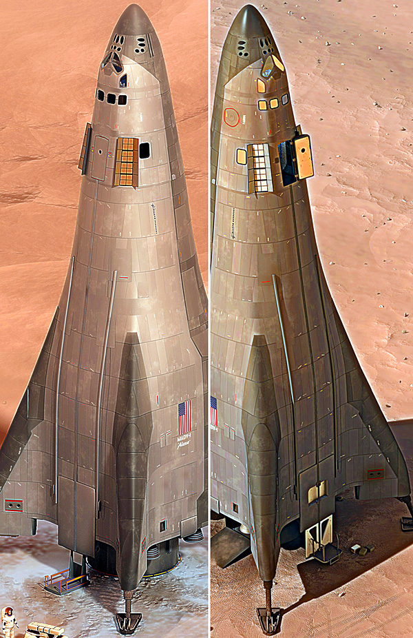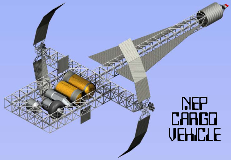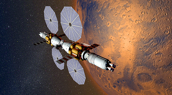 The piloted vehicle carries only the habitat module, the CEV, and a transfer node for docking. It too uses its NTR for MOI. The propellant tanks are arranged to optimize the center of gravity for tumbling pigeon operations. Upon arrival in Mars orbit it docks with the cargo vessel using the transfer node.