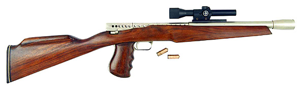 While this is a single-shot breech-loading target pistol, it chambers rifle ammunition with five times the volume of a comparable caliber pistol round, making it a heavy hitter. With only minimal alteration, the design would work as rocket-firing pistol, especially if the telescopic sight contained a dedicated ballistic computer.