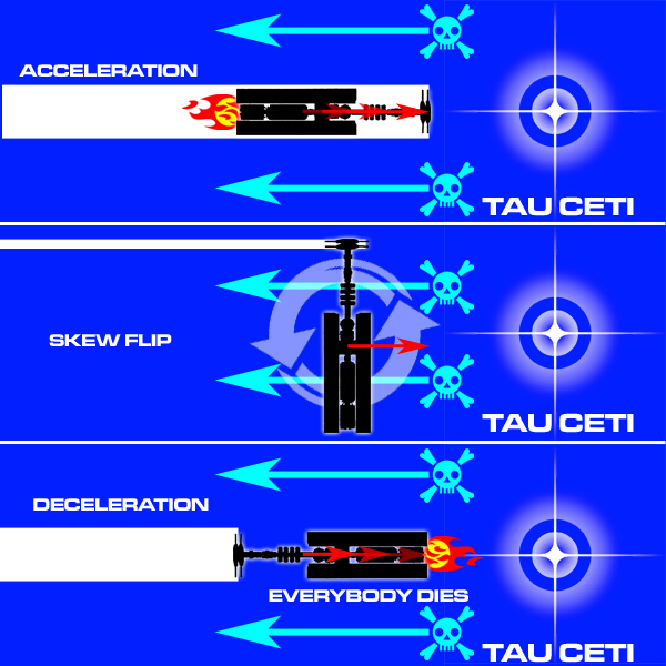 In addition to spare droplet fluid, our preliminary design calls for a spare engine. Both engines will be located at opposite ends of the tether. The forward engine pulls the ship along during the acceleration phase of flight. It also fires during the cruise phase, but only at one-hundredth thousandth of a gravity, keeping the tether taut and permitting recapture of forward flying droplets. At the end of the cruise phase, the rear engine kicks in for deceleration (as we cannot simply swing a ten-kilometer-long ship broadside to relativistic bombardment in order to turn the engine around and fire in reverse).