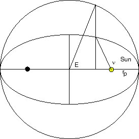 nu = 0 corresponds to point of closest approach to the Sun, called the perihelion (rp). nu = pi radians (180 degrees) corresponds to the point where the planet is farthest from the Sun, called the aphelion (ra). One other quantity we will need is the semi-major axis (a), which is half the length of the ellipse. For a circular orbit, this is just the radius of the orbit. It turns out that one needs six parameters, called "orbital elements", to completely define an orbit. We, however, will assume all the planets lie in the same plane (which they don't, but it's a pretty good approximation), so we can ignore some of them. For our purposes, we need only add one more, the longitude of perihelion (Pi). This represents the orientation of the orbit and gives the angle between the orbit's nu=0 line (which passes through perihelion, hence the name) and some arbitrary reference line. For the Solar System, that line is the line between the Sun and the "First Point in Aries", the position of the Earth on the vernal (spring) equinox.