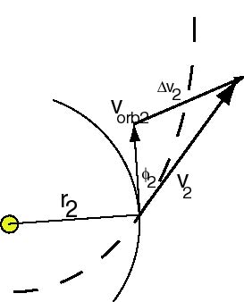DeltaV2(DU/TU)^2 = v2(DU/TU)^2 + vorb2(DU/TU^2 - 2 *v2(DU/TU) * vorb2(DU/TU) cos[phi2(radians)]