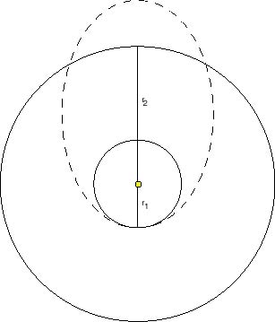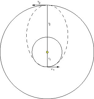 Now, how do we shift between two circular orbits? Obviously a circular transfer orbit won't work - as noted above, we'll always stay at the same radius. As we said at the beginning of this section, what we need is a transfer orbit that will intersect the orbits of both the origin and target planets. In 1925 Hohmann recognized that the minimum energy orbit between two circular orbits is an ellipse which is tangent at the perihelion of one orbit and at the aphelion of the other: