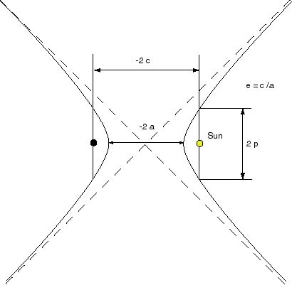 where a is the semi-major axis. From this equation we see that a circular or elliptical orbit has negative total energy, which means that the potential energy due to the Sun exceeds the kinetic energy of the spacecraft - the spacecraft is in a "bound" orbit. A hyperbolic orbit has positive total energy and therefore has more kinetic energy than potential energy - the spacecraft will escape from the Solar System. A parabolic orbit has zero energy - the spacecraft will just barely escape, actually only truly being free from the Sun at infinity. Putting this expression for the energy into the original equation gives: