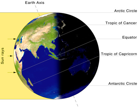 At the equator, the sun is visible bisecting the southern horizon for all 26 hours of the day on January 1. From January 1 to April 1, the sun starts to dip below the horizon at night, to rise higher above it during the day. During all this time it rises and sets at the same hours, but rises in the southeast and sets in the southwest. At noon it is higher each day in the southern sky until April 1, when it rises due east, passes through the zenith and sets due west. From April 1 to July 1, its noon position drops down to the north, until on July 1, it is visible all day, bisected by the northern horizon.